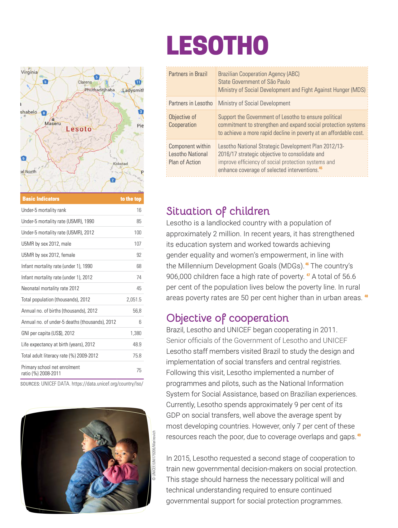 Brazil, Lesotho and UNICEF began cooperating in 2011. Senior officials of the Government of Lesotho and UNICEF Lesotho staff members visited Brazil to study the design and implementation of social transfers and central registries. Following this visit, Lesotho implemented a number of programmes and pilots, such as the National Information System for Social Assistance, based on Brazilian experiences.