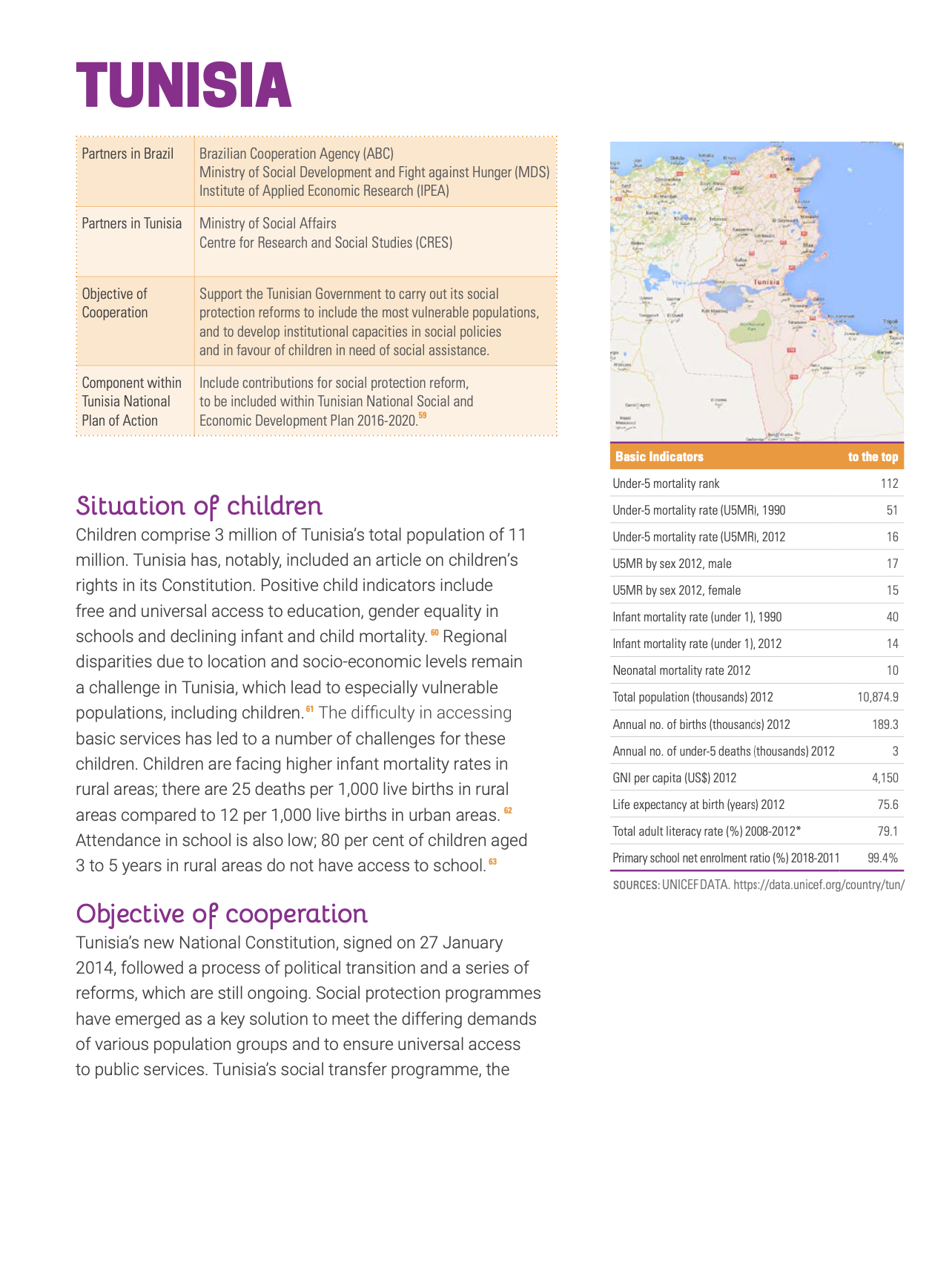 In 2014, Tunisia requested cooperation with Brazil to strengthen its social safety net programmes that account for the rights of children, adolescents and women.