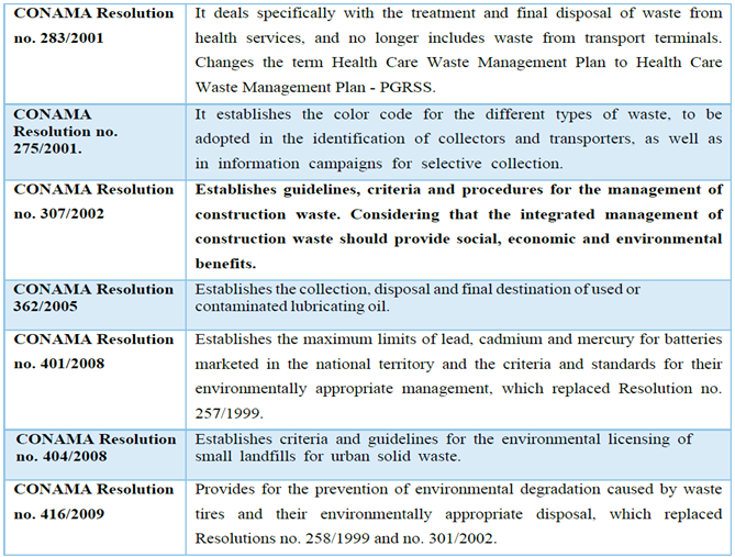 The National Council for the Environment (CONAMA) determines a series of Resolutions with the purpose of establishing guidelines, criteria and procedures for managing the various types of solid waste, in addition to guiding procedures for selective collection, management of special waste: hazardous, health, and civil construction, among others. The following table presents some CONAMA resolutions regarding the proper management of waste.