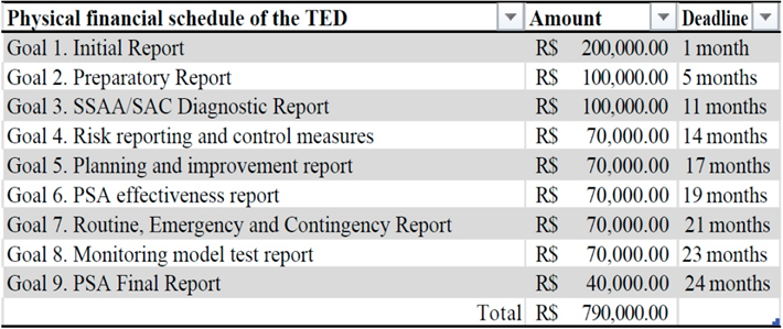 In 2021, a Decentralized Execution Term (TED, acronym in Portuguese) was established between the Brazilian Health Foundation and the Federal University of Campina Grande (UFCG, acronym in Portuguese) with the objective of training professionals involved in the entire process of providing water supply services, establishing criteria for prioritizing hazards and risks to be controlled in collective alternative water supply systems and solutions, from the source to the consumer, with the preparation of the Water Safety Plan (PSA) for 10 rural communities in the state of Ceará.