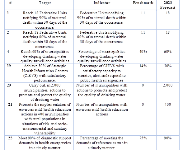 The National Health Plan is composed of seven objectives, and the actions related to WASH (acronym in Portuguese) are measured in the goals of the Objective related to Regulation, namely: "Reduce or control diseases and injuries that can be prevented and controlled." Among the 22 goals stipulated for this objective, those most related to the purpose of this mapping are expressed in the table below.