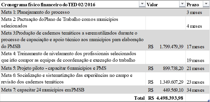 Conforme o TED, são previstas 7 metas para serem executadas a partir de janeiro de 2017 atpe dezembro de 2019, sendo divididas em 7 etapas conforme a descrição das metas abaixo: