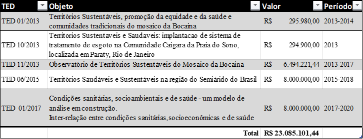O projeto Territórios Saudáveis e Sustentáveis possuiu um total de 5 TEDs entre Funasa e Fiocruz, sendo o último referente à publicação do compilado das ações e processos realizados de 2013 a 2020.